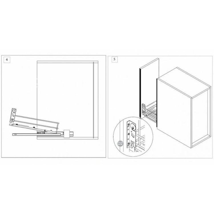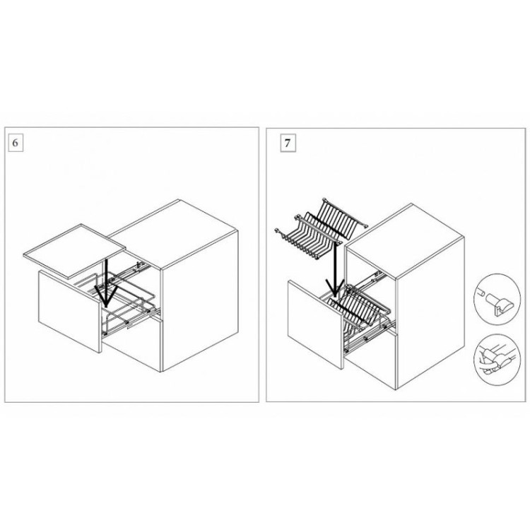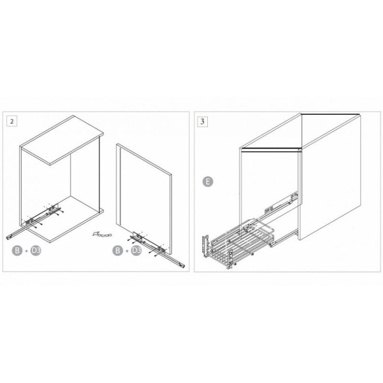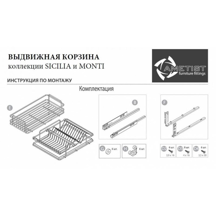 В комплекте: набор винтов для установки выдвижных корзин, адаптер направляющих правый+левый Hettich полного выдвижения, направляющие правая+левая Hettich с системой плавного закрывания, сетчатая одноуровневая полка с сеткой, металлический поддон, инструкция по установке.