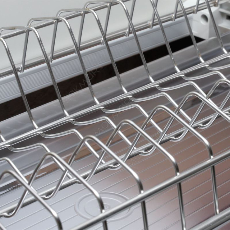 В новой версии сушки полностью обновлена конструкция рамки. Фронтальный горизонтальный профиль рамки приподнят над нижней плоскостью таким образом, чтобы было удобно открывать кухни без ручек, поэтому мы рекомендуем эту модель для кухонь с профилем Gola. Решетки выполнены из покрашенного оцинкованного прутка – такая сушка не подвержена коррозии и прослужит долгие годы. Комплектация: \nрешетка универсальная \nрамка алюминиевая \nподдон пластиковый