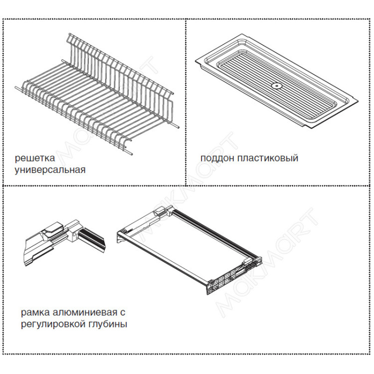 В новой версии сушки полностью обновлена конструкция рамки. Фронтальный горизонтальный профиль рамки приподнят над нижней плоскостью таким образом, чтобы было удобно открывать кухни без ручек, поэтому мы рекомендуем эту модель для кухонь с профилем Gola. Решетки выполнены из покрашенного оцинкованного прутка – такая сушка не подвержена коррозии и прослужит долгие годы. Комплектация: \nрешетка универсальная \nрамка алюминиевая \nподдон пластиковый