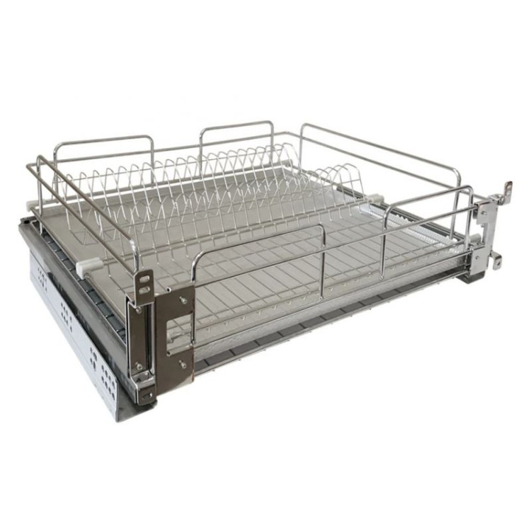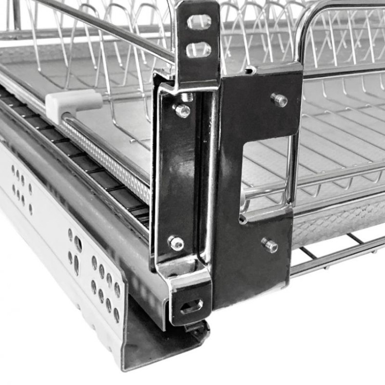 Материал корзины: Сталь Покрытие корзины: Хром Материал сеток: Нержавеющая сталь \ncушки для посуды в нижнюю базу полного выдвижения с доводчиком, с алюминиевым поддоном и фасадным креплением; \nдержатели тарелок и чашек изготовлены из нержавеющей стали; \nвесь комплект одним артикулом в одной коробке.