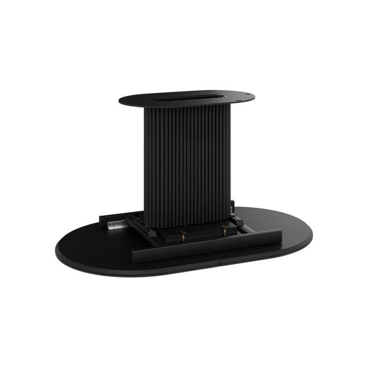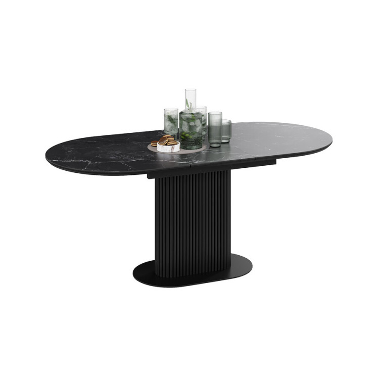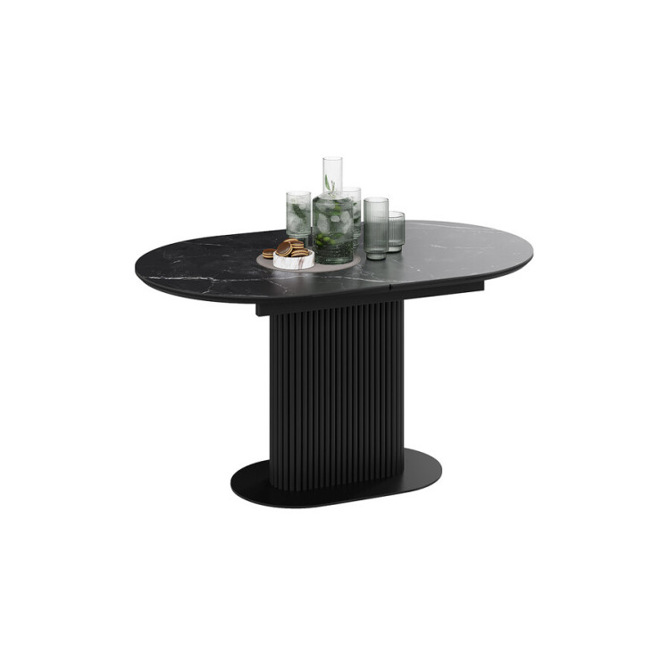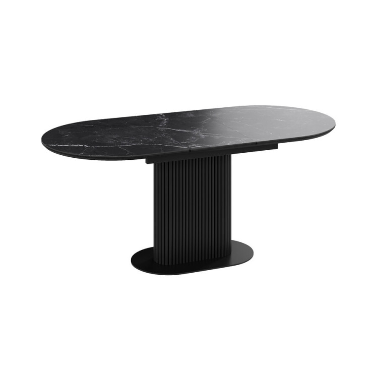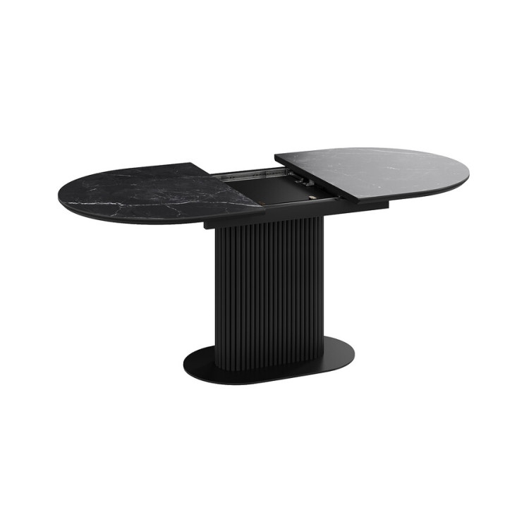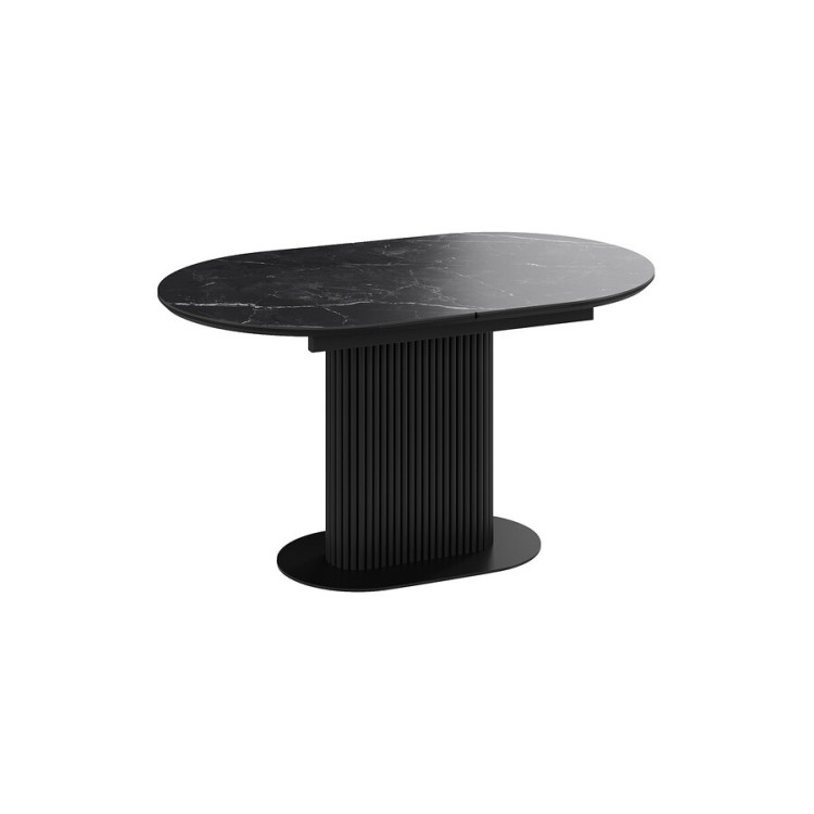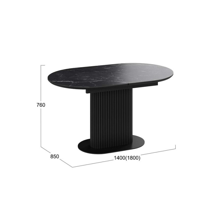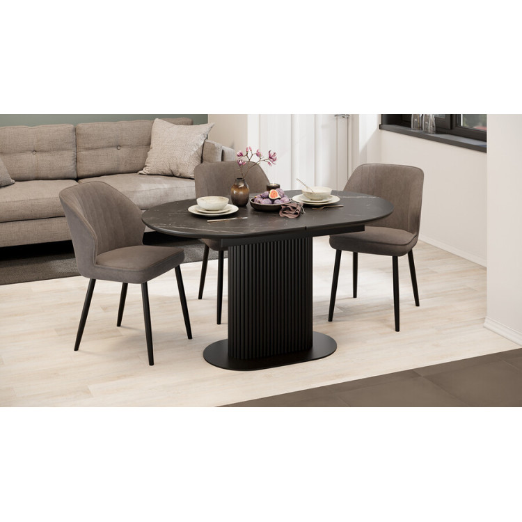 Материалы.  Раздвижная столешница изготовлена из МДФ 22 мм и керамогранита 6 мм. Опора в цвете «Черный муар» выполнена из металлических трубок, соединенных между собой, и расположена на устойчивом основании из металла. Овальная столешница и графичность основания подчеркивают утонченность этой модели.