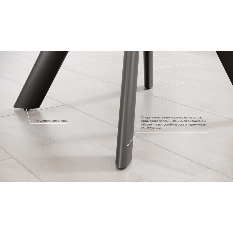 Материалы.  Столешница и вставка изготовлены из МДФ 22 мм и керамогранита 6 мм. Керамогранит отличается высокой прочностью, долговечностью, надежностью и термостойкостью. Он не требует особого ухода и не подвержен повреждениям при регулярном использовании. Опора и подстолье выполнены из металла и окрашены порошковой краской «Черный муар».
